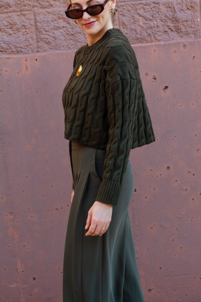 I started with a cropped cable-knit cotton sweater. I love this one from Aritizia because it’s cozy without being too heavy. The cropped length keeps the proportions clean next to a high-rise, pleated, wide-leg trouser. Modern look, with no sweater bulk to be found.